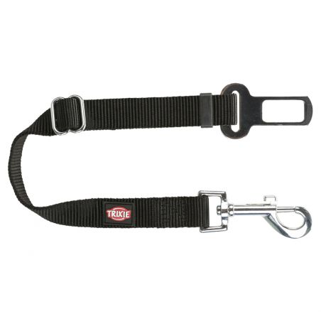 Réglable, elle dispose d'un mousqueton pour attacher au harnais de votre chien et d'un passant métalliques à insérer dans l'encoche de la ceinture de sécurité.