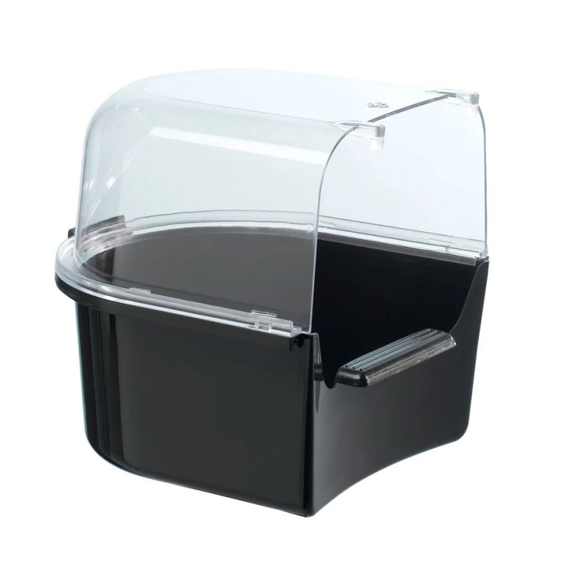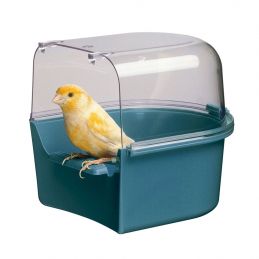 La baignoire pour petit oiseaux (canaris, exotiques) au design moderne possède une protection contre les projections d'eau.