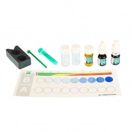 Contenance : 2 réactifs, seringue, 2 éprouvettes en verre à bouchon vissé, mesurette, comparateur et nuancier. Recharges de réactifs disponibles séparément.